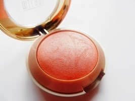 This is a peach-coloured blush with a golden shimmer to it. It falls on the orange-rose side of peach rather than rose-red or orange-yellow. I had a bit of a shock dipping my brush into this initially as it's very highly pigmented and dusts away so easily onto the brush that it's easy to disturb much more of the powder than you need. I've found that with highly pigmented products, in order to minimise the waste from 'tapping off' your brush all the time is to twirl the brush whilst laying it flat on it's side into the powder rather than swirling it point first (I hope that makes some sort of sense!).